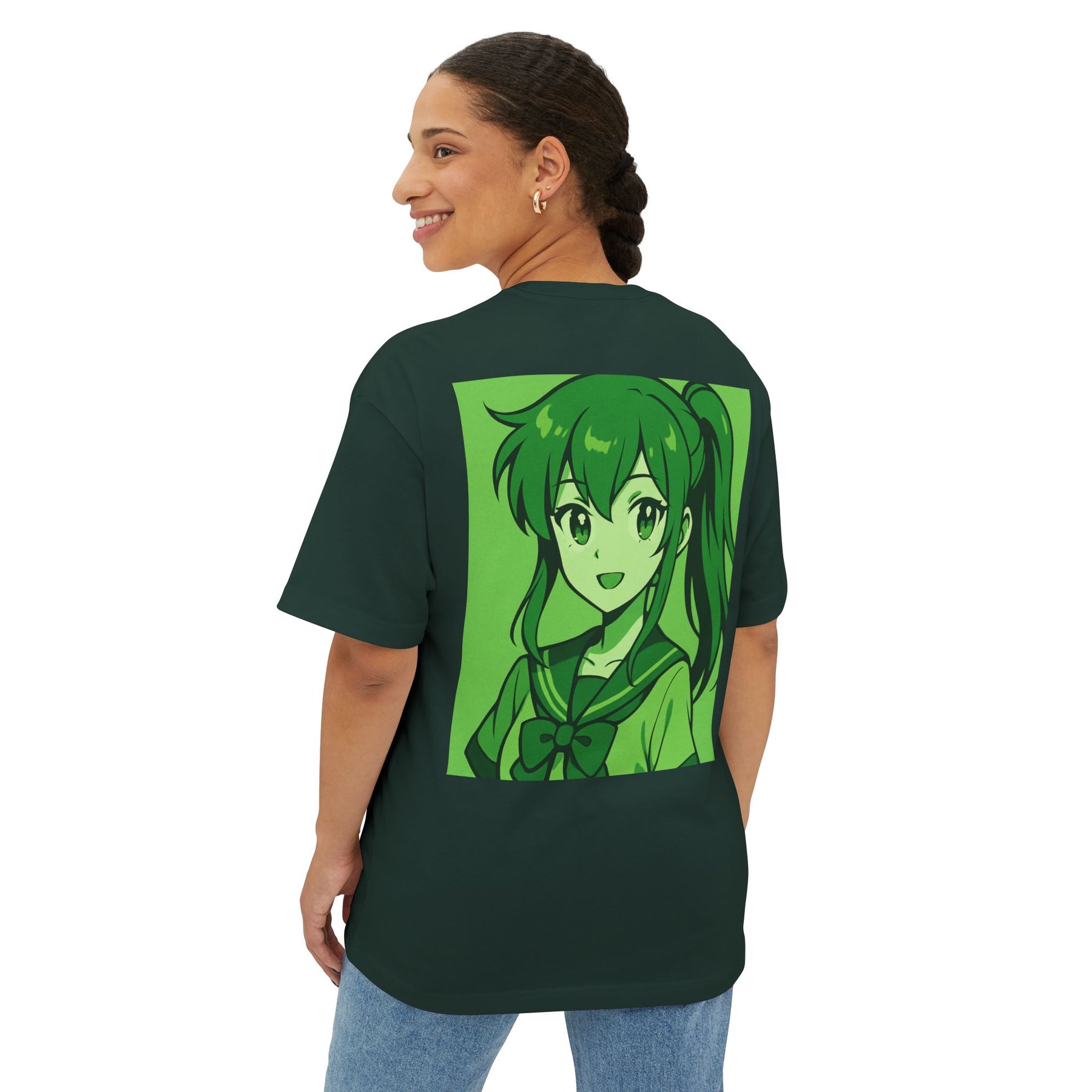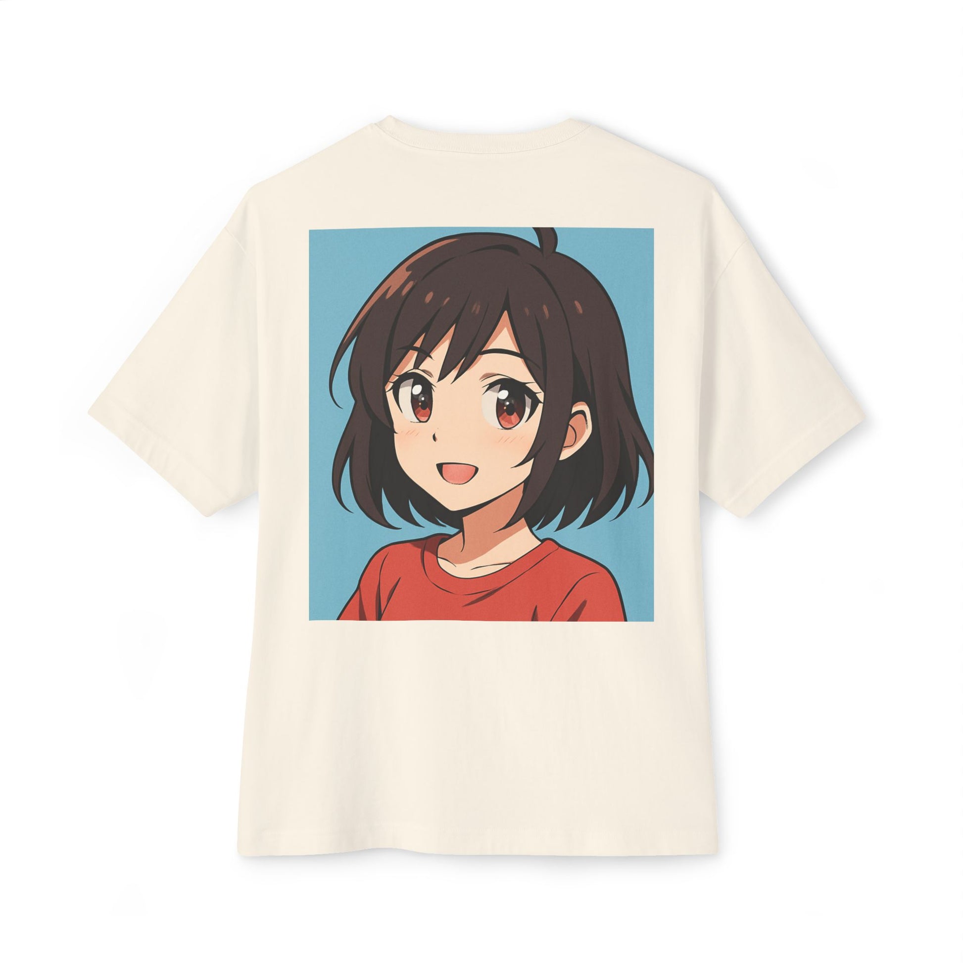 A comfortable and relaxed oversized boxy tee featuring an anime person design. Perfect for casual wear or lounging around at home. Ideal for anime enthusiasts and casual fashion lovers. Relevant for anime conventions, casual outings, and everyday wear.